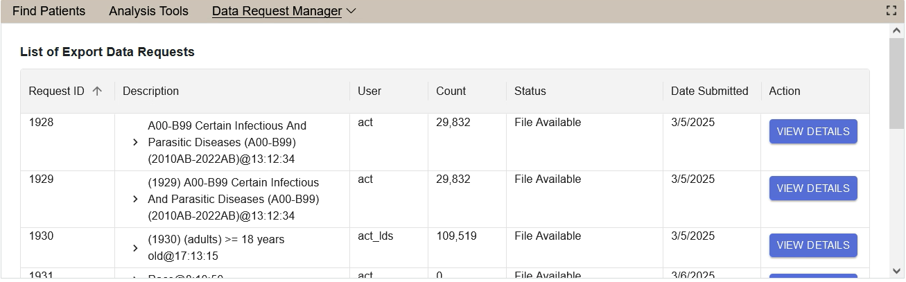 User-created data requests are managed by Data Request Manager tool where a manager user can view the request details and generate data files