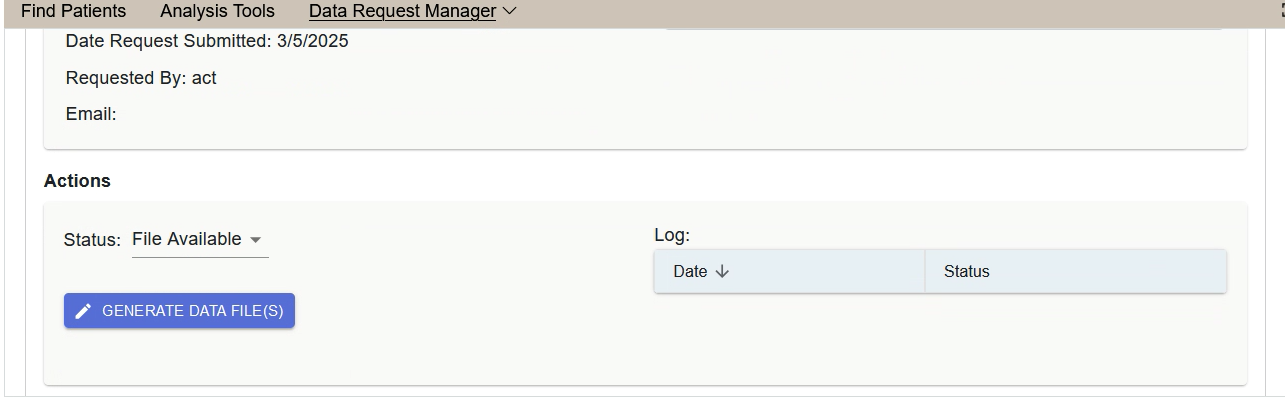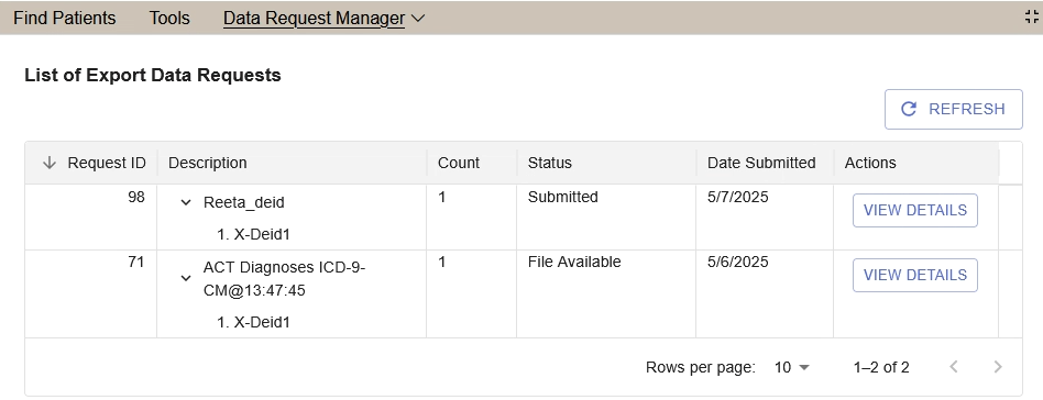 After the Data request query finishes (in the previous query panel), the request details and the status of the request are logged under the Data Request Manager tool.