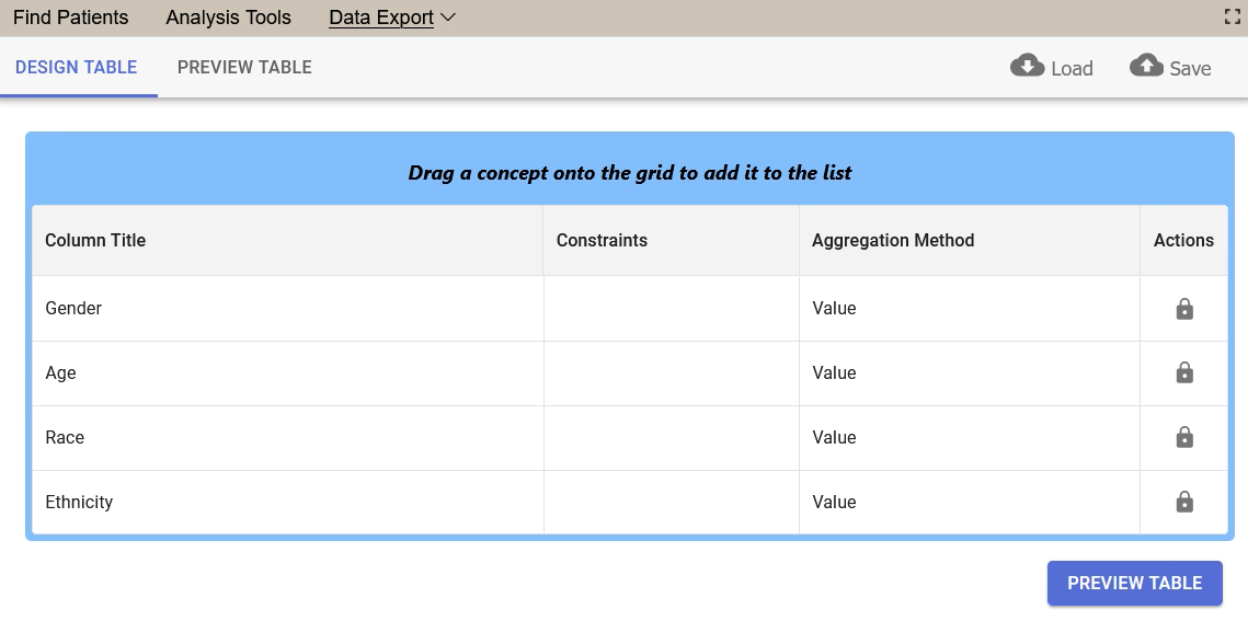 The Create Data Table feature allows User to design a table of variables of interest using the Design table feature. The table can then be saved as a template that can be loaded and re-used to request data export.