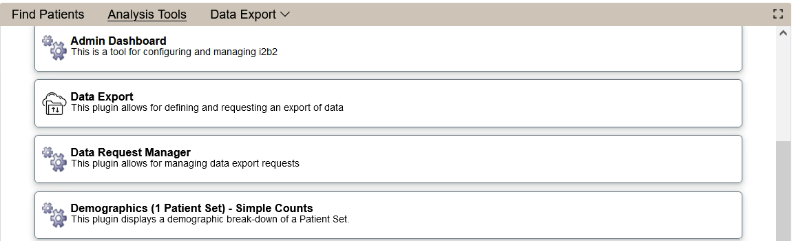 The Data Exporter functionality enables an i2b2 user to request patient data and create the data file for the patients found by a desired query. In the configured workflow, a table of variables is designed using create data table for export tool. The predefined data tables are then generated under Data Request breakdown types that can be selected in the Run Query dialog, After the query run, the data requests are displayed under the Data Request Manager tool. Users will be able to view their data requests as well as the status of the data file generation. When a data request is made, an e-mail is to a predefined data manager The data manager (Manager user role) processes the request by generating the datafile under the Data Request Manager tool. The patient data is exported as a file and stored in a specified location for retrieval.