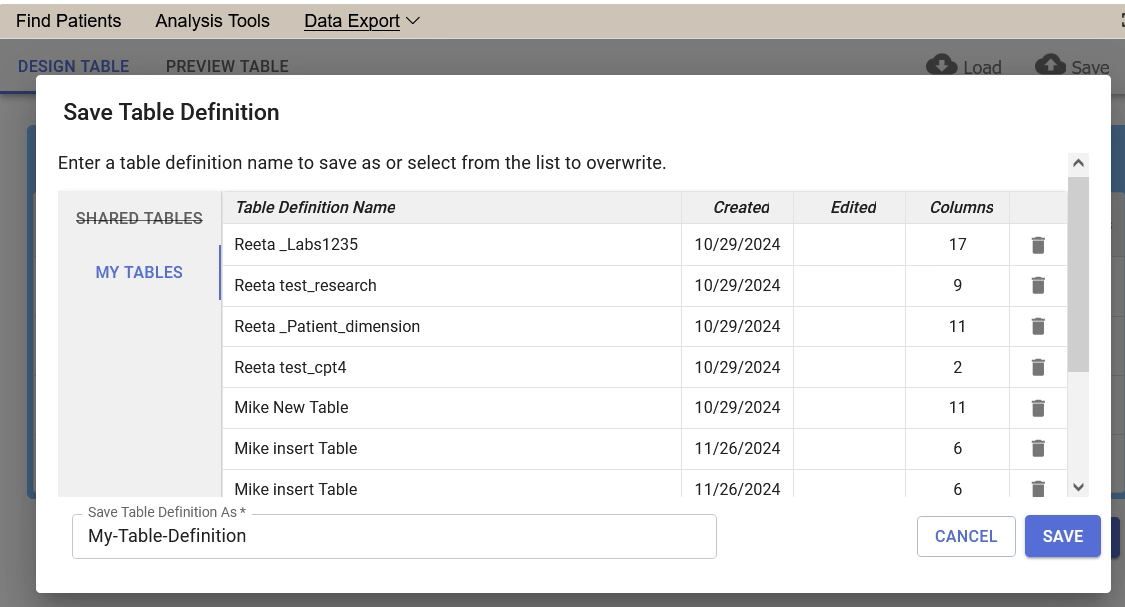 - User clicks on Load menu option to display the list of your saved Table definitions. Under MY TABLES,