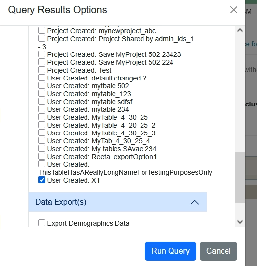 - In the Run Query dialog box, User created table definitions are displayed under Data Request(s) section