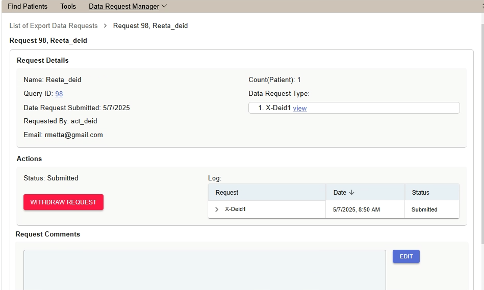 Note tthat if a Data Request is Withdrawn, you will need to submit request in the Comments box to reverse the Status.